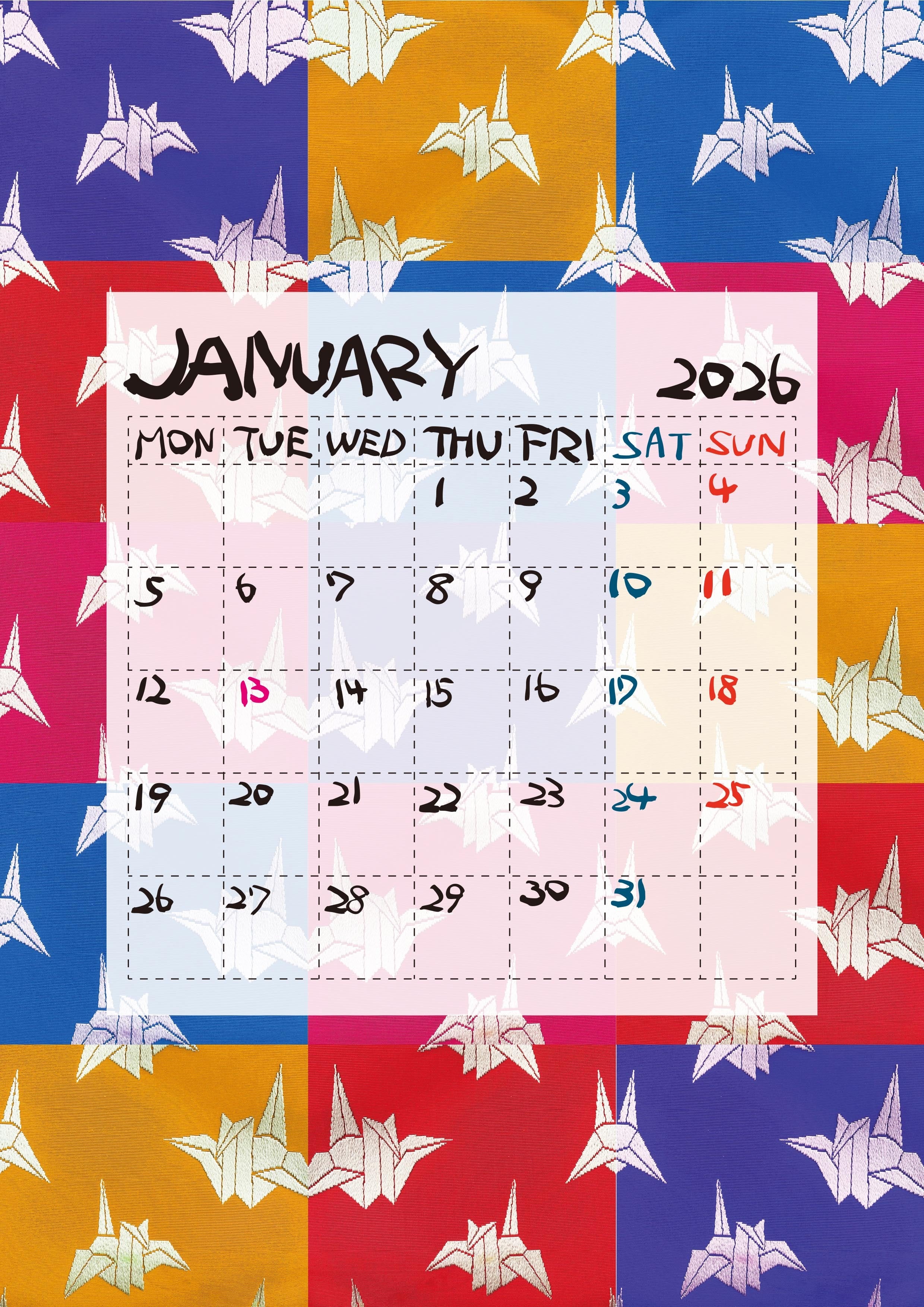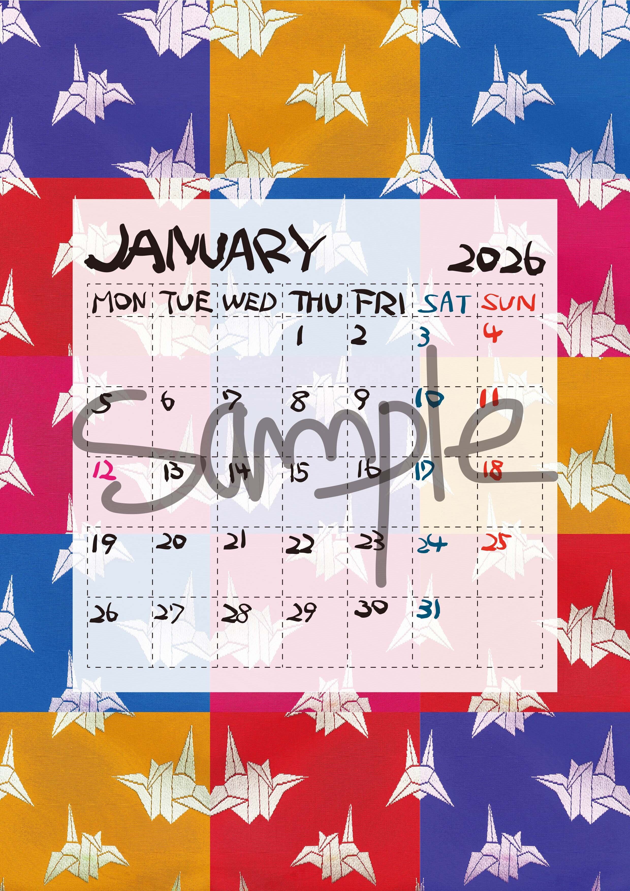 日本の伝統である帯の美しい柄をモチーフに、ポップでカラフルなカレンダーに仕上げました。
