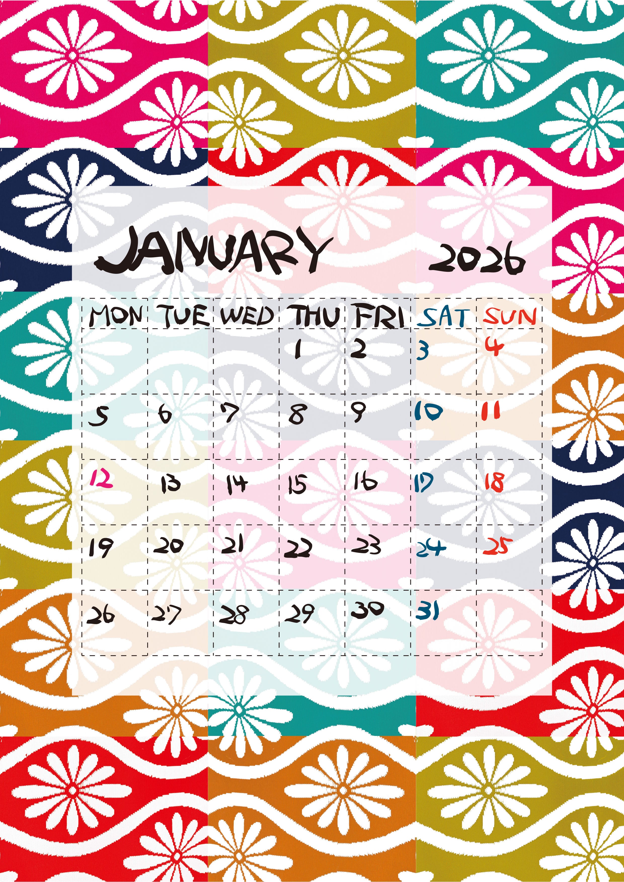 日本の伝統である帯の美しい柄をモチーフに、ポップでカラフルなカレンダーに仕上げました。